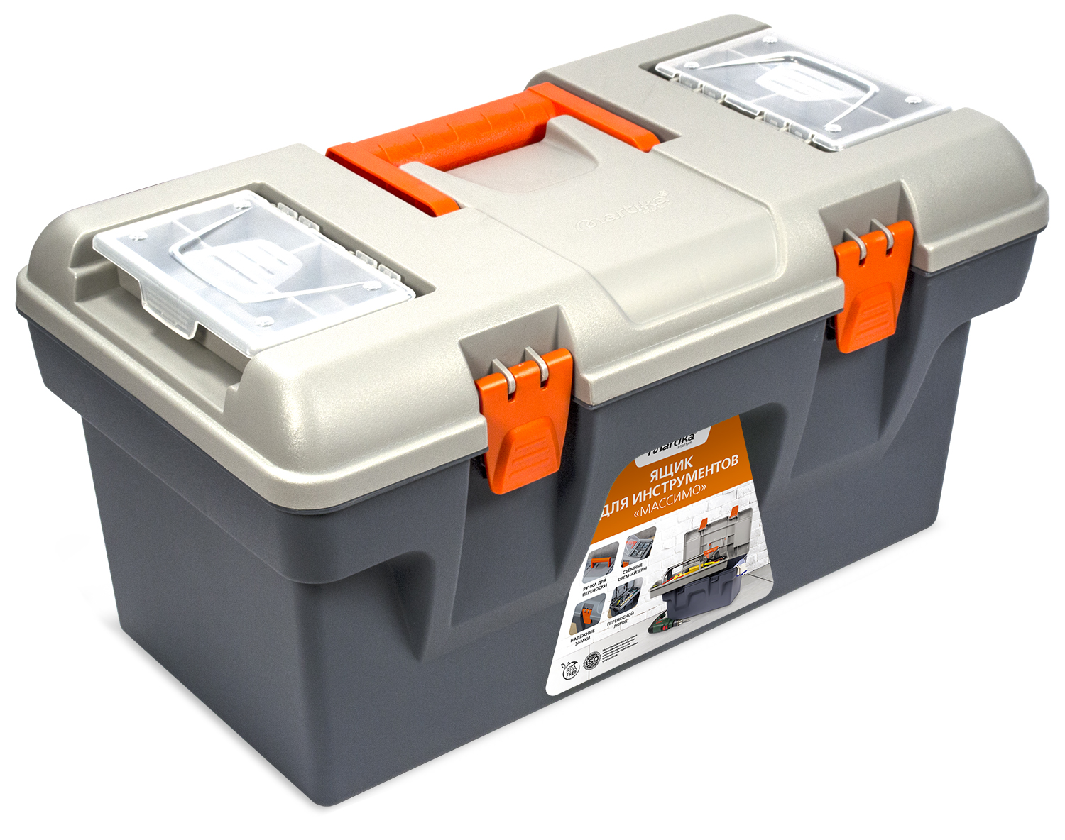 Ящики "Массимо" оптимальны для компактного хранения и переноски инструментов. Съемные органайзеры в крышке предназначены для упорядоченного хранения мелких деталей. Внутренний съемный лоток обеспечит доступ к часто используемым инструментам. Прочный и износостойкий корпус ящика и крышка с надежными защелками обеспечат долгий срок службы изделия и сохранность инструментов. Ящик изготавливается из прочного и долговечного полипропилена, подходящего для помещений с повышенной влажностью или перепадами температур, в том числе для гаража или балкона. Ящики «Массимо» представлены в трех объемах – 16'', 19'', 22''.