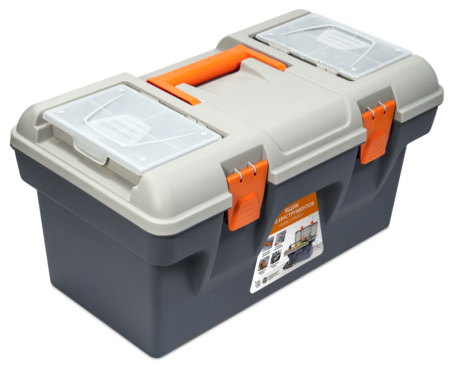 Ящики "Массимо" оптимальны для компактного хранения и переноски инструментов. Съемные органайзеры в крышке предназначены для упорядоченного хранения мелких деталей. Внутренний съемный лоток обеспечит доступ к часто используемым инструментам. Прочный и износостойкий корпус ящика и крышка с надежными защелками обеспечат долгий срок службы изделия и сохранность инструментов. Ящик изготавливается из прочного и долговечного полипропилена, подходящего для помещений с повышенной влажностью или перепадами температур, в том числе для гаража или балкона. Ящики «Массимо» представлены в трех объемах – 16'', 19'', 22''.