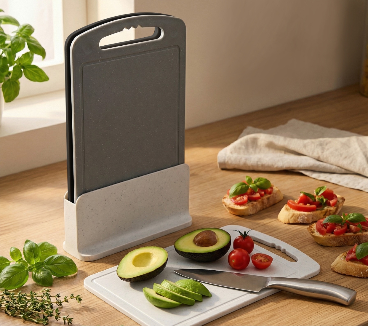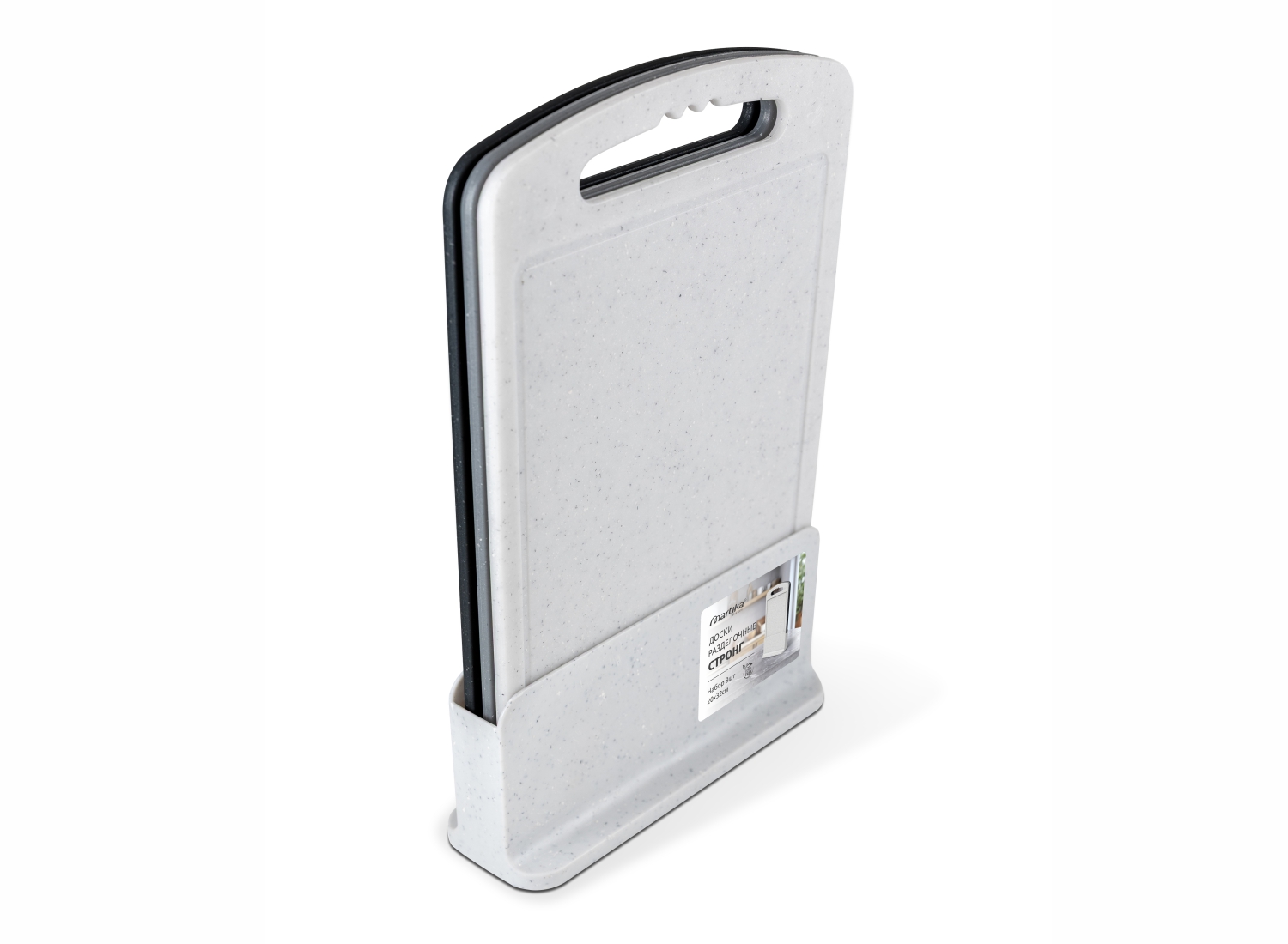 Набор состоит из трех досок коллекции «Стронг» размером 20х32 см в цветах - «белый камень», «серый камень» и «черный камень» с целью дифференциации для нарезки различных продуктов. Минималистичный дизайн и универсальные оттенки, имитирующие «натуральный камень» гармонично вписываются в интерьер современной кухни. Благодаря компактным размерам кухонный аксессуар не занимает много места на столешнице. Специальная конструкция подставки с вентиляционными отверстиями на дне позволяет надежно удерживать доски, давая им хорошо просохнуть.