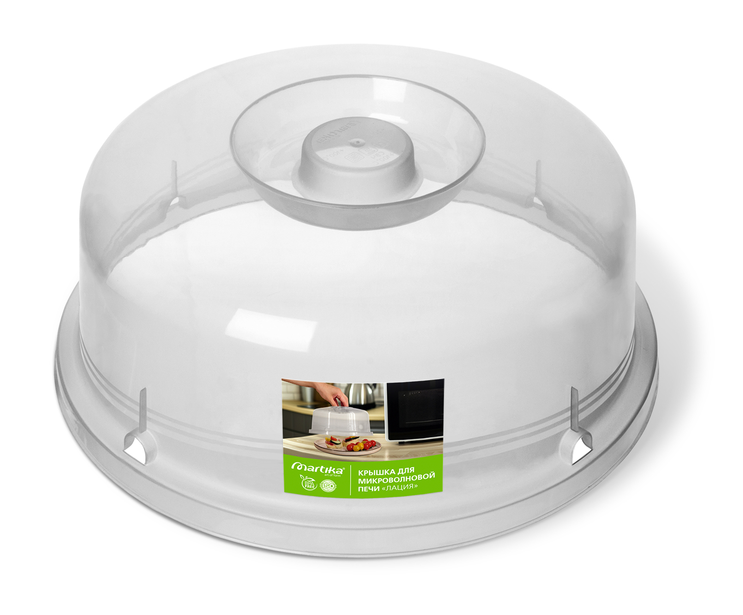 Крышка для микроволновой печи с отверстиями для выпуска пара предохраняет внутреннюю поверхность микроволновой печи от брызг во время разогрева пищи. Имеется удобная ручка для удержания крышки. Можно дополнительно использовать как крышку на блюдо для торта, сыра и т.п.
