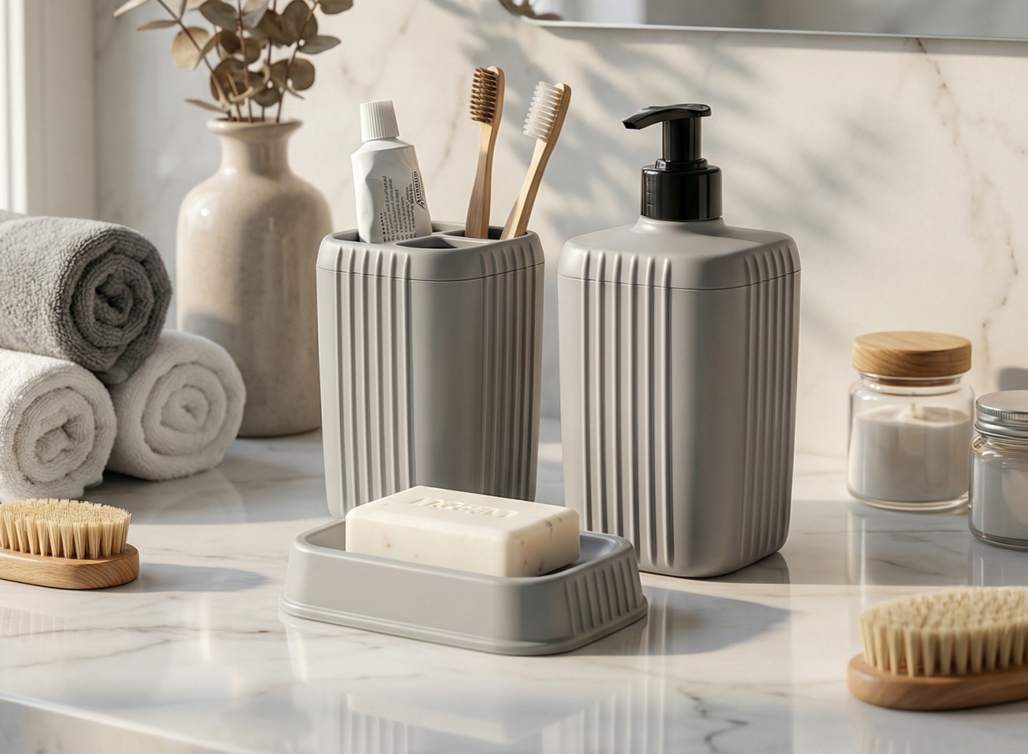 Изделие выполнено из качественного пластика, что обеспечивает долговечность и возможность эксплуатации в условиях повышенной влажности. Материал обладает хорошей устойчивостью к механическим повреждениям в отличие от керамики или стекла. А матовая поверхность с эффектом soft-touch создает приятные тактильный и визуальный эффекты. Компактный аксессуар имеет оптимальный объем 0,5 л, не занимает много места на раковине или полке. Укомплектован помповым дозатором с поворотным механизмом фиксации. Изделие выполнено в минималистичном дизайне и нейтральной цветовой гамме, что делает его идеальным выбором для любого интерьера.