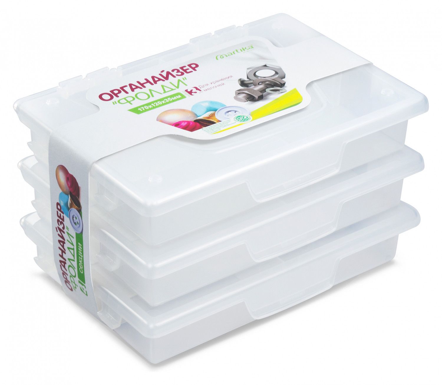 Комплект из 3-х органайзеров «Фолди» предназначен для хранения и переноски различных мелких предметов: швейных и рыболовных принадлежностей, медикаментов, крепежных изделий и мелких инструментов, карандашей и фломастеров. С помощью съемных перегородок можно легко менять размер отделений. Отделения органайзера позволят систематизировать мелкие предметы, а прочный замок-защелка обеспечит плотное закрывание крышки.